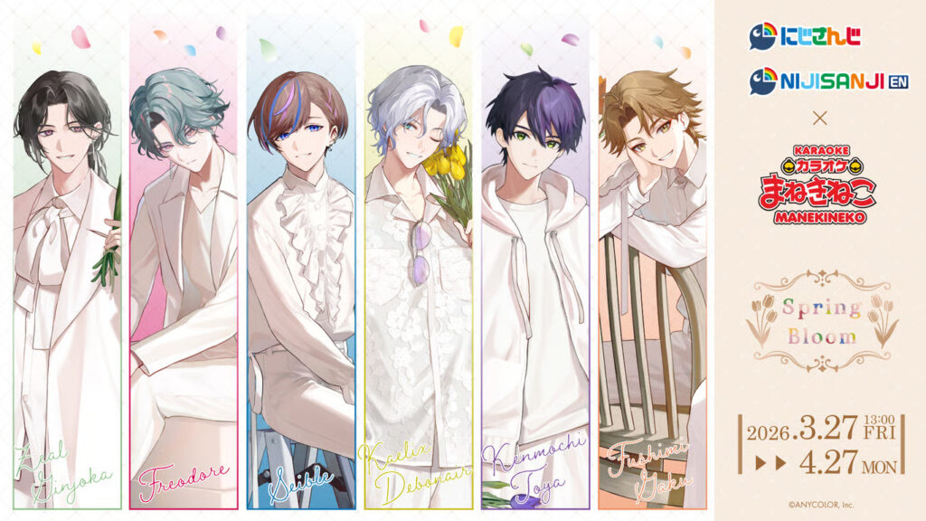 Karaoke Manekineko is proud to announce a special regional collaboration with NIJISANJI/NIJISANJI EN, bringing the “Spring Bloom” campaign to outlets across Malaysia, Indonesia, and Thailand from March 27 to April 27, 2026.The stars of this campaign are NIJISANJI’s unit “Togabito” — Kenmochi Toya and Fushimi Gaku — alongside NIJISANJI EN’s latest wave “By the Beat”: Zeal Ginjoka, Freodore, Seible, and Kaelix Debonair. Each member is featured in elegant white outfits accented with tulips in colors that perfectly complement their personalities, giving the entire campaign a bright and refreshing vibe.